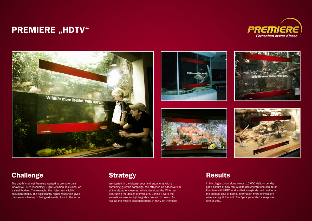 Hier gleich noch eine Aktion der Düsseldorfer DDB, diesmal für Premiere: im Zoo wurden auf die Schaufenster von Terrarien und Aquarien transparente Folien geklebt, die den Umriss eines Fernsehers abzeichneten. In der Mitte des “Bildschirms” stand die Botschaft: “Wildlife more lifelike”, und spielte damit auf die enorm gute Qualität der Übertragungen bei Premiere (in diesem Fall von Tierdokumentationen) in HDTV an. Ebenso scharf und echt würden die Besucher auch von der Couch aus wildes Leben betrachten können. Super Umsetzung, denn hier wurde die Aktion perfekt auf die richtige Zielgruppe zugeschnitten- man vergleiche eine ähnliche Aktion des Pay-TV-Senders für Fußballübertragungen (hier im Blog weiter unten).